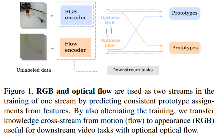 옵티칼 플로우와 비디오 frame을 함께 활용하는 video ssl 방법입니다. optical flow는 모션 정보를 포함하고 있으므로 더 많은 정보를 활용할 수 있습니다.