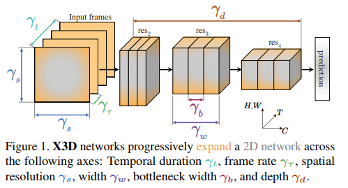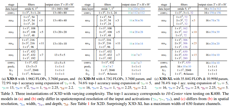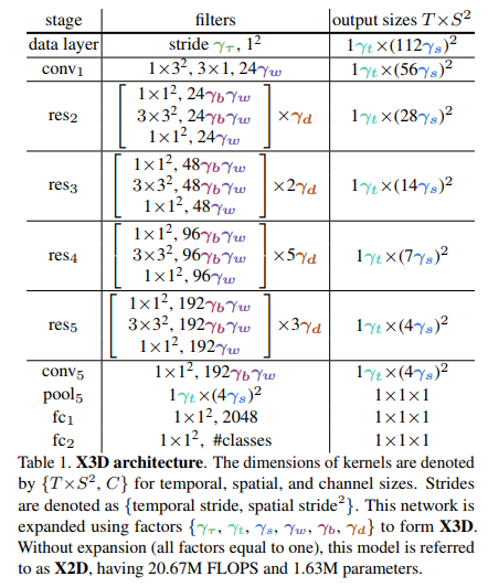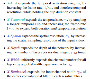 Backbone model은 mobile Net의 depthwise-separable 구조를 사용합니다. 일반적으로 2D 모델을 3D로 적용할 때 temporal axis를 확장하는 것만 고려하는데, 해당 논문에서는 다른 axis를 확장해도 성능이 상승한다는 것을 보여주어 temporal axis 뿐만 아니라 여러 요소를 고려해야 한다고 말합니다.