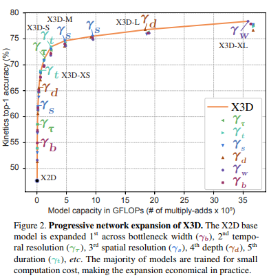 feature selection 방식으로 제한된 연산량 내에 높은 성능을 갖는 axis를 기준으로 확장해 나갑니다. forward 방식을 사용하는데 첫 번째 step 에서는 bottleneck width, 두 번째 step은 temporal, 세 번째 step은 resolution ... 순서로 확장합니다. 위 그림에서 각 step마다 어느 축이 확장되는지 확인하실 수 있습니다.