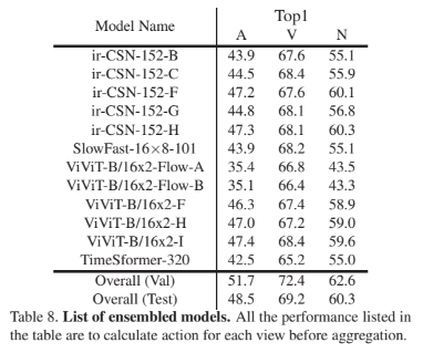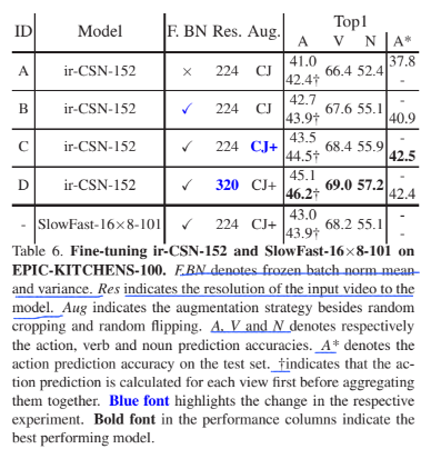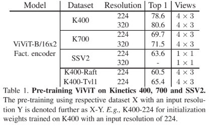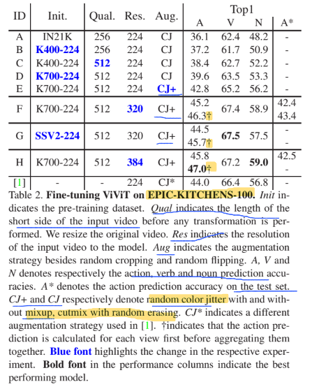 우선 ViViT를 kinetics400, 700, SSV2로 pre-train 한뒤에 EK dataset에 fine tuning 합니다.