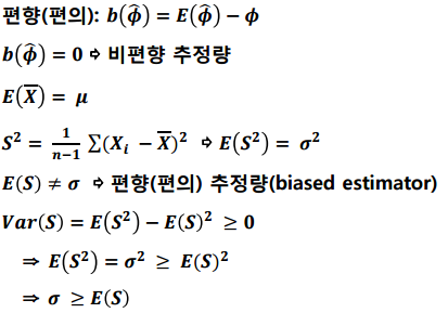 편향(편의)는 추정량의 기댓값 - 실제값을 의미합니다.
