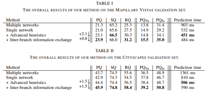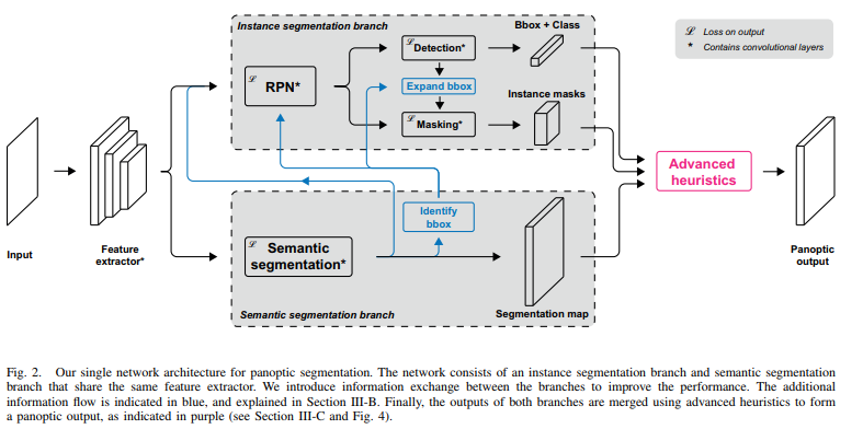 semantic branch와 instance branch로 구성된 single network를 사용하여 panoptic segmentation을 수행합니다.