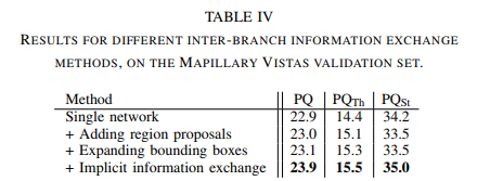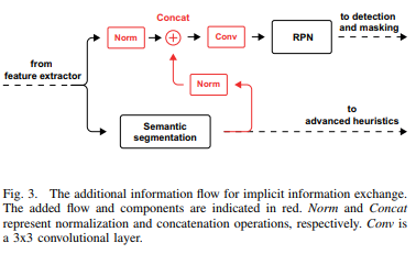 instance branch의 예측값은 thing prediction만을 포함하므로 semantic branch의 thing에 대한 예측값이 더 낫다고 설명합니다. 따라서 정보 손실이 발생하는데 이를 보상하기 위하여 다음의 방법을 사용합니다. semantic branch의 softmax이전 출력값을 nomalize하고 feature extractor의 normalized 된 feature와 concat를 합니다. 이후에 3x3 conv를 적용하고 이 출력값을 instance branch로 전달합니다. 이를 통해서 instance, semantic branch의 성능을 향상시킵니다.