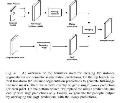 instance, semantic branch의 출력값을 merging하여 panoptic output을 생성합니다. semantic branch 출력값의 things를 stuff로 대체하고 thing은 instance의 출력값을 사용합니다.
