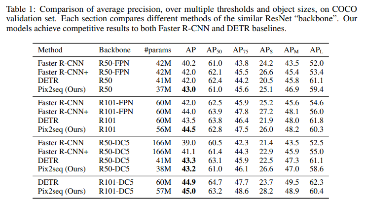 위 표는 성능표인데, Pix2seq는 augmentation을 강하게 적용합니다. 다른 모델들도 augmentation을 강하게 적용했다면 성능이 2~3%는 향상됬지 않을까 싶은데...
