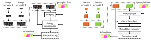 저자의 아이디어는 고전적인 optical flow 알고리즘의 세 가지 원칙을 CNN 모델에 적용하는 것입니다. 세 가지 원칙은 (1) pyramidal processing, (2) warping, (3) cost volume 인데, 이를 적용하여 model size를 감소할 뿐만 아니라 성능 또한 증가합니다. 이 세 가지 원칙을 어떻게 구현했는지 살펴보겠습니다.