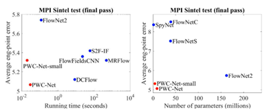 해당 논문은 Optical Flow를 prediction 하기 위한 딥러닝 모델입니다. 위 그림을 보면 빠른 running time, 적은 파라미터 수로 낮은 error를 달성하는 것을 살펴볼 수 있는데, 그 만큼 효과적인 모델을 제안합니다.