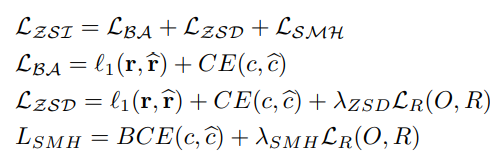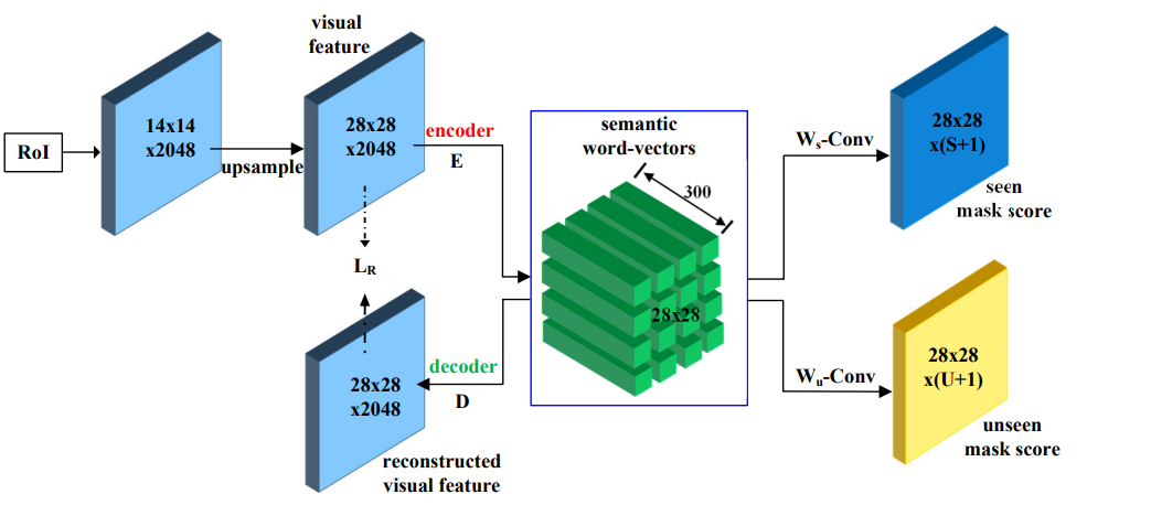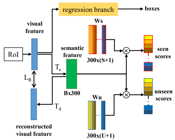 RoI Align을 거쳐서 visual feature를 얻는다. 이 visual feature에 encoder를 적용해 semantic feature를 얻는다. 얻은 sematic feature와 word embedding 사이의 행렬곱 연산을 통하여 seen과 unseen에 대한 score를 얻는다. decoder도 사용되는데 이는 semantic feature에 적용하여 visual feature를 reconstruct 한다. 두 visual feature 사이의 reconstruction loss를 이용해 difference를 감소시킨다.