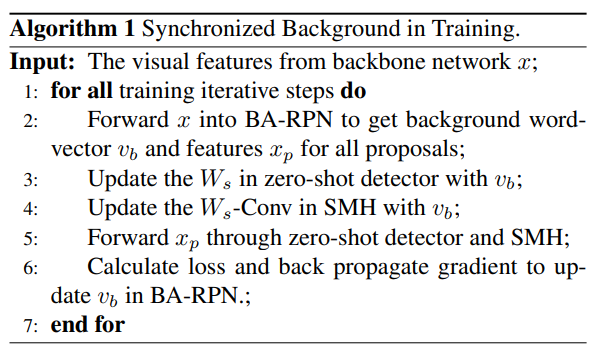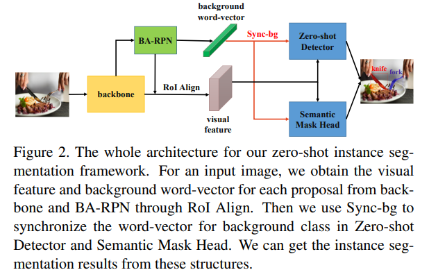 5가지 구성요소가 존재한다. (1) backbone, (2) BA-RPN, (3) Sync-bg, (4) zero-shot detector, (5) semantic mask head