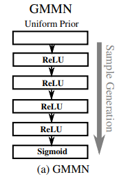 논문에서 제안하는 GMMN은 하나의 신경망을 이용하며 Maximym Mean Discrepancy loss를 최소화하면서 학습을 진행합니다.