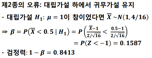 검정력은 (1 - 제2종의 오류 확률)을 의미합니다. 제2종의 오류는 대립가설이 참일때 대립가설을 거짓으로 판변할 것입니다.