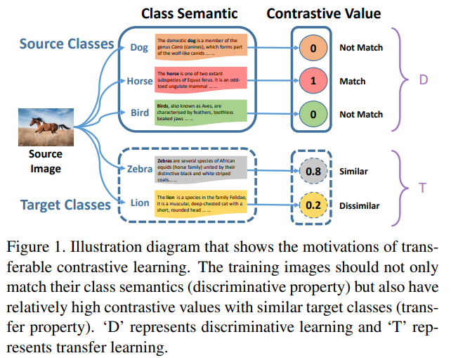 위 그림을 보면 논문의 Motivation을 알 것 같다. Contrastive를 도입하여 얻고자 하는 성질은 (1) discriminative properfy, (2) Transferable property이다.