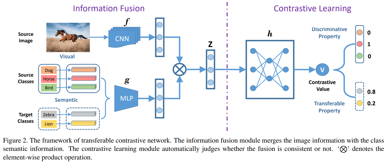 하나의 이미지를 여러 class descriptor와 contrast 하기 위하여 information을 fuse한다. 이미지로부터 CNN이 추출한 feature와 semantic information으로부터 MLP로 추출한 feature를 element-wise product하여 information을 fuse 한다.