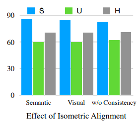 재밌는 점은 consistency loss에 관한 부분이다. visual attention module을 semantic space에 적용하여 similarity가 동일해지도록 했는데, 이는 feature도 동일해지므로 성능에 악영향. consistency loss는 output similarity만 동일해지도록 할 뿐, similarity 계산 전 feature는 다르다. 즉, 두 space상의 각 class에 대한 feature는 꼭 같은 필요가 없다는 것 !!!