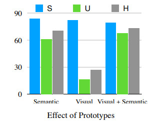visual space, semantic space 상의 prototype을 사용하지 않고, 한가지만 사용한 실험에서 semantic prototype 만을 사용한 것이 성능이 더 좋았다. 물론 둘다 사용한게 더 좋았음 ㅎㅎ. visual prototype은 unseen에 대한 sample을 사용하지 않는 반면에, semantic prototype은 unseen에 대한 semantic representation 정보를 지니고 있기 때문이라고 설명한다. 즉, 둘중 하나의 prototype을 사용해야 한다면 semantic representation을 활용해 prototype을 만드는 것이 낫다는 말!! 내 연구에 참고를 할 수 있을 듯? 근데 사실 당연한 말이긴 하다. zero shot은 semantic 정보를 활용해서 seen으로 학습한 지식을 unseen으로 transfer 하는게 기본 컨셉. 두개의 prototype을 사용했을 때 성능이 높은 이유는, visual prototype이 visual feature와 semantic feature을 연결해주고 추가적인 정보를 제공하기 때문이라고 설명한다.