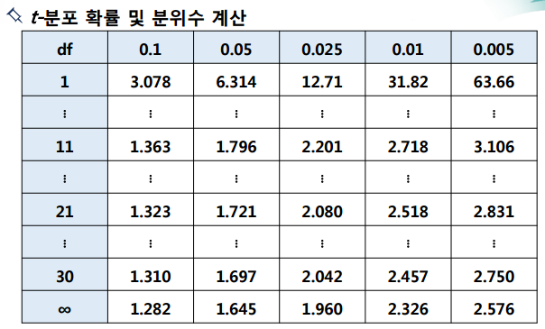 t-분포 확률 및 분위수 계산은 표를 보고 확인할 수 있습니다.