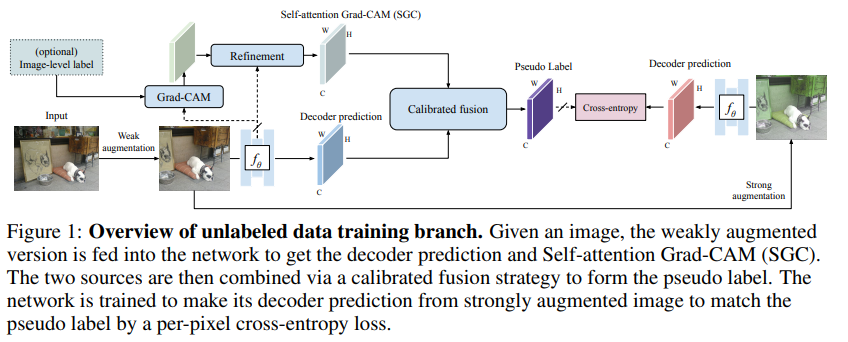pixel label이 존재하면, 이미지에 weak augmentation을 준 뒤 모델로 전달하여 얻은 prediction과 gt사이의 cross entropy loss를 계산.