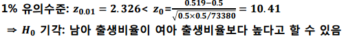 남아 출생비율이 여아 출생비율보다 높은지를 검정하겠습니다.